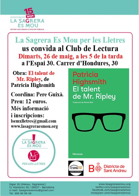 La Sagrera Es Mou per les Lletres organitza una nova sessió del seu club de lectura, dedicada a l’obra El talent de Mr. Ripley de Patricia Highsmith, amb la coordinació de Pere Guixà.