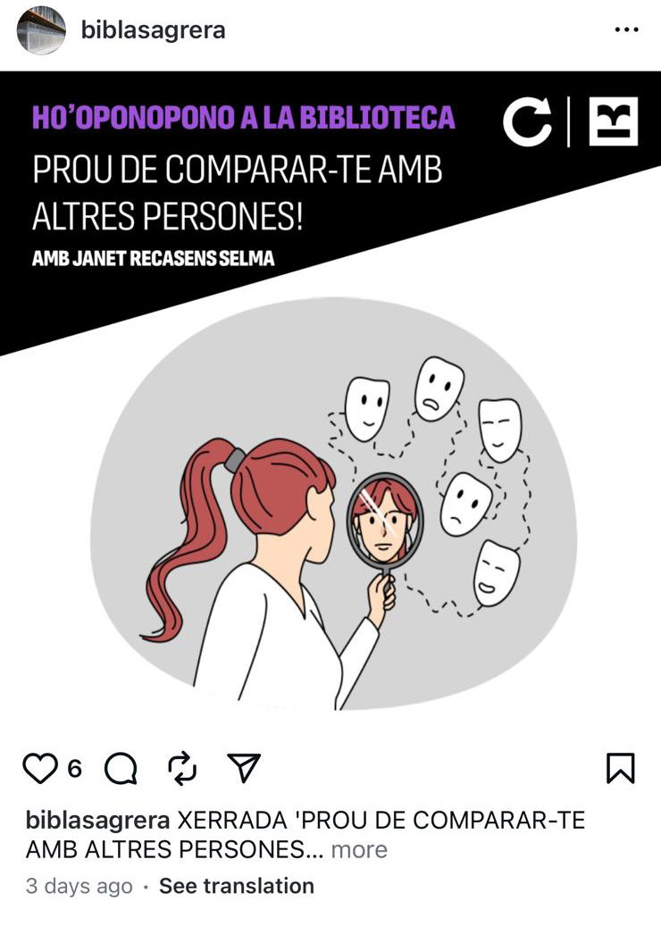 Aprenem eines i recursos per evitar la comparació amb d’altres persones i reconeixer la nostra vàlua. Amb Janet Recasens Selma. No cal inscripció prèvia.