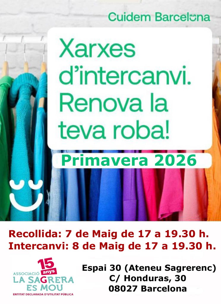 Nova edició de les xarxes d’intercanvi de roba dins la campanya Cuidem Barcelona. Recollida de roba: 7 de maig, de 17 a 19.30 h Intercanvi: 8 de maig, de 17 a 19.30 h Espai 30 (Ateneu Sagrerenc)