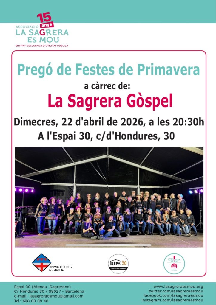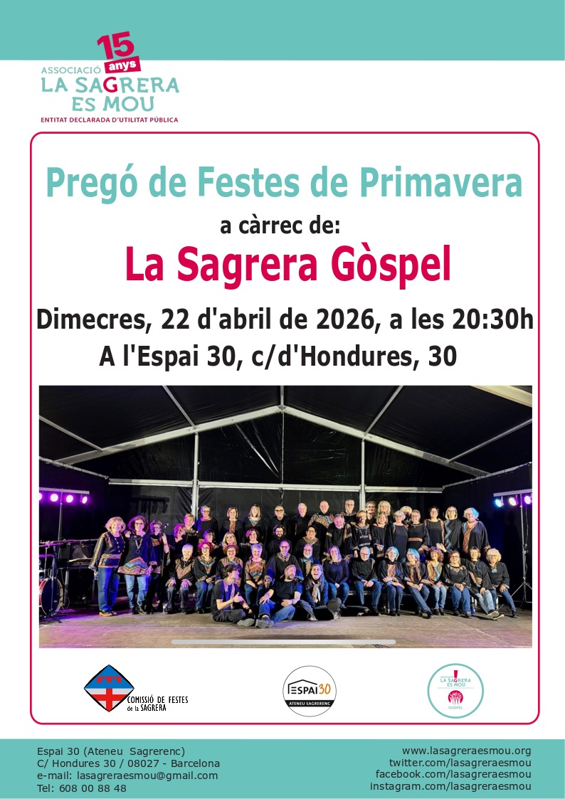 Les Festes de Primavera de La Sagrera arrencaran amb el tradicional pregó, que aquest any anirà a càrrec de La Sagrera Gospel.