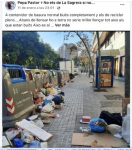 Seguretat o neteja en són bons exemples, en el tema de la neteja el veïnatge ha posat darrerament a les xarxes socials algunes fotografies denunciant el lamentable estat a redós dels contenidors de brossa comuna o selectiva, i els comentaris han estat abundants, però majorment les acusacions apunten, per una banda, a actituds incíviques de no dipositar els residus dins del contenidor i, altres apunten a persones que buscant entre bosses, les obren i deixen escampades les deixalles.