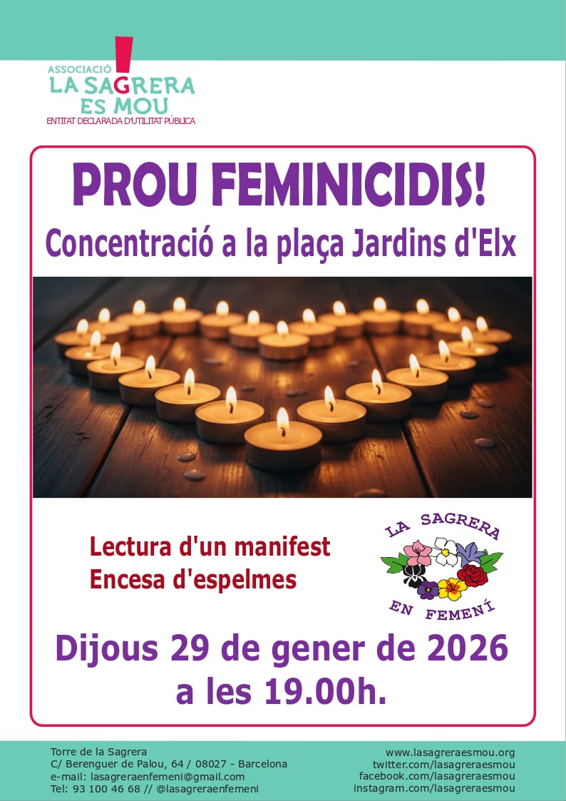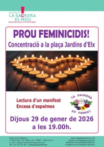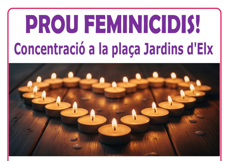El col·lectiu La Sagrera En Femení convoca una nova concentració contra els feminicidis el dijous 29 de gener a les 19 h a la plaça Jardins d’Elx, amb lectura d’un manifest, un minut de silenci i l’encesa d’espelmes. L’acte vol ser un espai de denúncia, memòria i sensibilització davant la violència masclista.